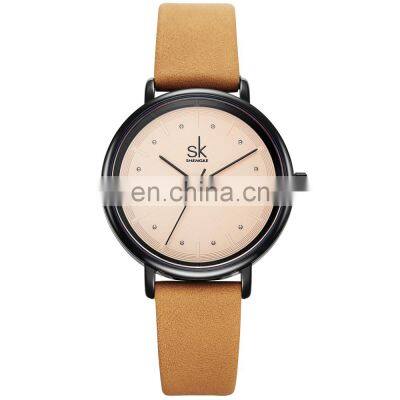 SHENGKE Simple Lady Watch Elegant Dial Soft Leather Band Japanese Quartz Movement Wristwatch Gift For Girl K8005L FAQ1.What is your MOQ (MOQ=Minimum Order Quantity)?If you order our brands (SINOBI / SK) watches which we have in stock, no MOQ limited, you can buy how many you want, and can mix with different models and different colors; OEM or ODM order with brand your logo, the MOQ depends on the case material: alloy case watches MOQ is 300pcs, stainless steel case watches MOQ is 500pcs2.Can you provide sample first before I place mass production order?Yes, we can provide samples for your reference, and the sample fee will be returned to you when you order mess bulk products which reaches minimum order quantity 300~500 pieces3.How about your products quality?Our quality had praised so many clients , quality advantage as below:1)All our SINOBI and Shengke (SK) watches are at least 3ATM water resistant, 100% tested by Waterproof Testing Machine.2)All our brands’ watches are vacuum plated,color would last at least 1~2 years.3)For OEM or ODM watches, we will produce the watches as your requirements. It can comply with CE&RoHS, etc. You can arrange your QC team or hire the third party to test the watches before delivery.4.How long is your warranty time?All our Sinobi and Shengke (SK ) brands watches’ is 12 months warranty.5.What's the delivery time?If take our brand logo watches, the delivery 3~7 days after payment. For OEM orders, the delivery time is : alloy case watches 20~25 days , stainless steel case watches 45~50 days.6.How about shipping methods?If you have a courier in China, goods can be sent to your courier after payment; If you have no cooperated courier, we will check the shipping details and cost for you after your final order is confirmed.7.What's your payment terms?1)For our stock Sinobi and SK brand watches , payment should be arranged 2~3 days before shipping .2)For OEM/ODM with brand your own logo, 50% desposit before production, 50% balance before shipping.8.Are you factory or trade company?We are factory (in Gunagzhou, China). If you are interested in our factory, please contact us for more details.