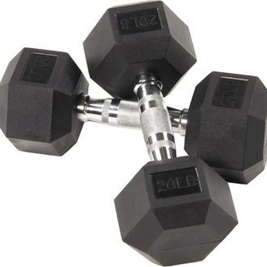Product Description 1. PROFESSIONAL QUALITY GRADE - One piece cast iron coated with protective rubber heads, contoured textured chrome handle, and engraved weight indicators. 2. SINGLE SOLID CAST IRON CORE: Constructed of high-quality solid cast iron core to add more durability & stability. Will not break or bend after repeated use 3. HEXAGONAL RUBBER HEADS: Special shape prevents rolling away from the storage place or during your floor exercise, while rubber coating reduces noise and protects your workout area 4. NON SLIP-GRIP: Contoured textured Chrome handle minimizes hand fatigue while maximizing grip comfort and controlling 5. VERSATILE WORKOUT: Great to use in any fitness class or program to tone and sculpt your arms, shoulders & back, including cardio for higher intensity. Used for Alternated Biceps Curl, Triceps Kickback, Lateral Raise, Stationery Lunge Detailed Photos