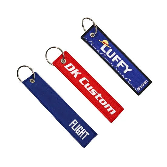 | Custom Promotional Logo Anime Remove Before A Flight Crew Double Sided Woven Fabric Embroidery Embroidered Key Jet Tag Keychain |