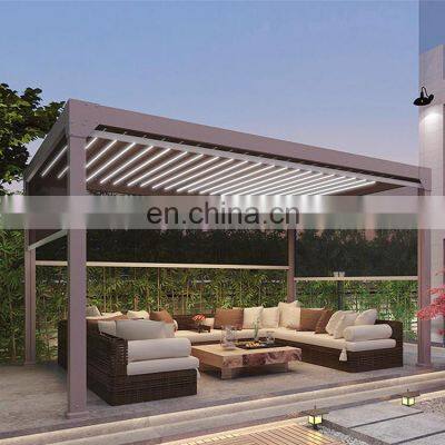 Products Description Aluminum sunshade louver pergola roof systemPergoLam is a combination between pergola and horizontal louver which is completely made of aluminum and allows light and breezewhen open. Using an electric telescopic engine connection system through parts and aluminum extrusions specially designed, theslats are dosed completely sealed preventing the passage of light and water. When closed the slats become channels that carry thewater to the sides that have their own system of canals and water should turn towards the poles where it drains. Guaranteed towithstand severe climatic changes and winds of up to 100 KM/h . (The resistance is not guaranteed under the weight of snow).● Aluminum Frame ● Wind Resistance ● Energy savings ● Rainproof Flap ● Engines Control ● Multiple Mounting Options ● Customized DesignSpecifications Of Aluminium PergolaMaterialAluminium Optional AccessoriesSide Screen/ LED Light/Wind & Rain Sensor/Heater,etcRianfall Intensity0.04-0.05L/S/m2Snow LoadUP to 120kg/m2Win ResistanceUP to 120km/h for closed bladesMaximum Width2.5m - 13.5mMaximum Projection2.5m - 5.8mElectric Motor's Voltage110V Or 230VRemote Control1 Channel or 5 ChannelLinear Strip LED Lights3000K YellowMax Size of Side Screen5m x 3mInstallationThe installation instruction or video will providedCompany ProfilePackingFAQQ: Are you manufactory or trade company? A: We are manufactory with 5000 square meter space specialized in producing all kinds ofawning parts as well as R&D. Q: Does your company can provide a variety of customer specifications? A: In addition to our standard, we provide a variety of customer specifications. Q: How can I get a sample from you to ensure the products’quality? A: Yes, free sample is availalbe. Q: What's your delivery time? A: Usually 10-25 days upon receipt of 30% deposit,based on the product items and time you order. Q: What's your payment term? A: T/T, L/C etc. Q: What is the MOQ? A: It depends on the item you order.Some are with MOQ.Some normal items are without MOQ.Welcomd your inquiry..