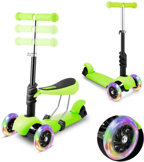 About this item ★Wheels Light Up: The LED lights on when front wheels rotate fast, it looks awesome and especially cool, bring a lot of fun to your child, he/she will always smile while on this toddler scooter. ★Height Adjustable & Seat Removable: This 2-in-1 scooter is designed for children to move forward by sitting first. When the child grows up, the seat can be removed to stand and slide. The handlebar has 4 adjustable height options. (21/24.6/27/29.3 inch) Suitable for kids ages 2-10 with a weight capacity of 110 lbs. ★Helpful for Balance and Ride: This kids scooter uses the LEAN-TO-STEER technology, help child exercise, practical for the balance of the body, develop balance skills, coordination and more , perfect for your toddler to learn how to ride. ★Smooth and Safe Ride: The three wheels of this kids scooter are made of widened and thickened PU material, it runs smoothly even on surfaces that are uneven and bumpy, make for great balance, they are smooth and super quiet. Turn by gravity technology protects against dangerously sharp turns for kids. ★Easy to Assemble and Carry: This kick scooter with removable seat is really easy to install and take with you in the car, so parents could bring around and travel with. This scooter can accompany the growth of your kids, great gift for your kids. Packing & Delivery Packing: Official Standard Packing+double foam +seven layer corrugated carton