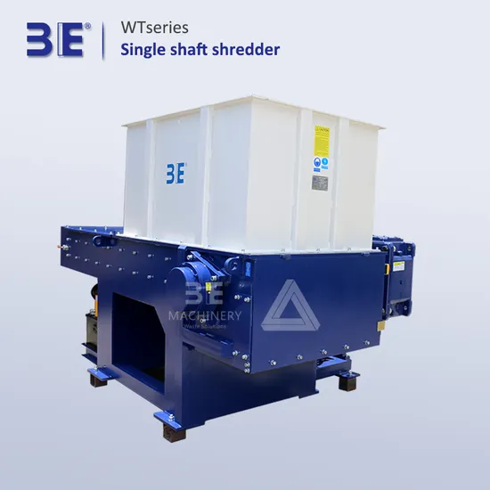 3E MACHINERY's (WT22/30/40 series) single shaft shredder is a widely used type of recycling machine. It's an ideal machine widely used in plastics, paper, wood, fiber, rubber, organic waste and non metallic materials. It consists of a single solid shaft with square blades bolted into it. This shaft rotates at about 74-83 RPM, depending on the model, and these blades pass through a bed knife on the base of the cutting chamber. A hydraulic ram continually pushes the material against the shaft of the shredder for continuous cutting. It is almost always used with a screen, which retains the material in the cutting chamber to reduce the material even further. And the standard cut on a single shaft shredder is 25-40mm.