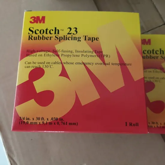 Product Description 3M Rubber Splicing Tape 23 is a black, 30-mil (0.76 mm) thick, premium grade, highly conformable, rubber splicing tape composed of a self-fusing Ethylene Propylene Rubber (EPR) backing supplied on a removable polyethylene liner. It withstands temperatures up to 194 °F (90 °C) with an emergency overload rating to 266 °F (130) COMMON USE: Used as primary insulation for cable splice and termination applications up to 69kV (ASTM D4388, Type III) COMPATIBILITY: Compatible with common solid dielectric cable insulations OPERATING TEMPERATURE: Rated to 194 °F (90 °C), emergency overload rating to 266 °F (130 °C) HALOGEN FREE: Per International Electrotechnical Commission (IEC) 61249-2-21 standard COMPLIANCE: ASTM Approved & RoHS Compliant STABILITY: 5-year shelf life (from date of manufacture) For industrial/occupational use only; not for consumer sale or use