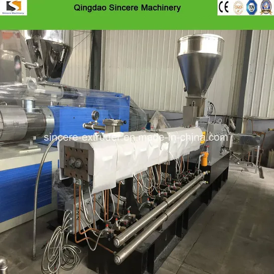This pelletizing machine is composed by a conical twin-screw extruder and the correspondingly pelletizing downstream equipment, it is suitable for the pelletizing of PVC, WPVC, WPE raw materials with wood powder or other additives. The pellets produced by this machine is evenly, solid and elegance. The pelletizing downstream equipment is the die face cutter, air transferring unit, vibration separating and cooling unit. This pelletizing downstream equipment has the features of high automation and high production efficiency.