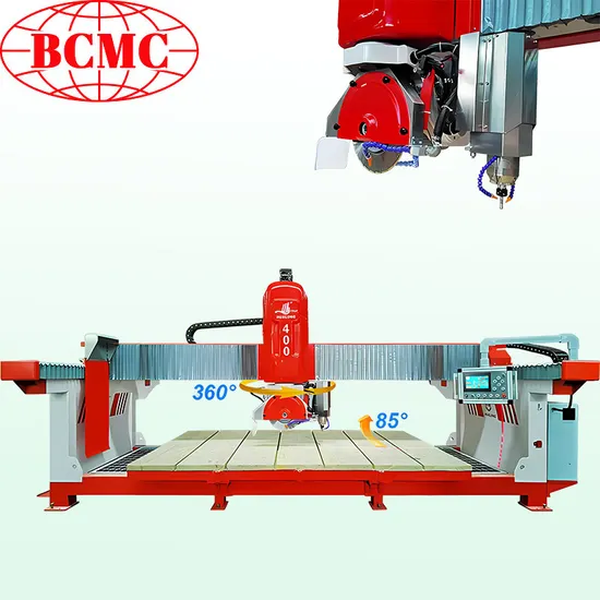 BCMC Machinery BCSQ-350C and BCSQ-350F are kind of 4 axes integrated construction bridge saw. Suitable for granite, marble, sintered stone, tile, porcelain and other kind of stone processing. Monoblock shape and beauty. Updated from BCSQ-350 3 axes interpolated into 4 axes interpolated. For simple shape cutting ever preset in the machine with one click control.