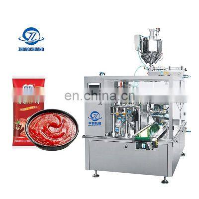 Product ParamentersItem NO.ZC-Y200/250DimensionsL4000mm×W2000mm×H2100mmPacking Speed16-60 Bags/min (depending on products character and filling volume)Packing Bag SizeL: 100-350mmW : 60-200mm/80-250mmWeight1800KGAir Compressed air consemed≤0.6m³ / minAccuracy±1g (≤100g) / ± 1%( >100g) according to materialApplicationSuitable for liquid or semifluid products packing, such as beverages, juice, ketchup, bechamel etc.Working Procedure1.Bag feeding2.Coding3.Opening4.Filling A5.Filling B6.Heat sealing A7.Heat sealing B8.Forming and outputDescription1.According to customer demand for customized, to recommend the appropriate products to customers.2.Storage racks devices which can Satisfy the products short stop ,which can keep the production line work continuously.3.Good service,If you have any questions, you can communicate by telephone video.Recommend ProductsProducts DescriptionCompany ProfileFAQTrade patterns 1. Lead time: 15-20 working days after receive deposit2. MOQ: 1 set.3.30% deposit+ balance payment before delivery by T/T, western union, cash.4. Loading Port: Shantou or Shenzhen Port Export Process 1. We will prepare goods after receive deposit 2. We will send goods to your warehouse or shipping company in China.3. We will give you tracking number or Bill of loading when your goods is on the way 4. Finally your goods will arrive your address or shipping port Frequently Asked Questions Q: First time import, how can I believe that you would send products? A: We are verified company by Alibaba to make transaction success, we support and recommend you to pay money to us by Alibaba Trade Assurance.Q: How about the quality of your product?A: Our products manufactured strictly according to national and international standard-- We have ISO certification-- We take a test on every product before delivery.Q: How to choose the machine type for our bags? A: Pls support us the following information about the bag and the food. 1) Bag pattern (Bag samples or pictures would be appreciated.)2) Bag size 3) The filling weight or volume 4) Material of food: powder/liquid/paste/granular/massiveness Q: What aftersales service or any question about products?A: This machine enjoys 1 year warranty