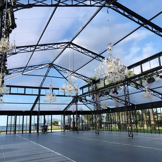 | Tent Features | 1. All aluminum alloy frame and steel frame, both available, windload 70-100km/h 2. Easy assemble and dismantle, reusable for 5-15 years 3. Tarpaulin with double-coated PVC, fire resistant, temperature resistance -30°~+70° 4. No bearing column, inner space 100% used 5. Modular structure, width from 3m~50m, length no limited