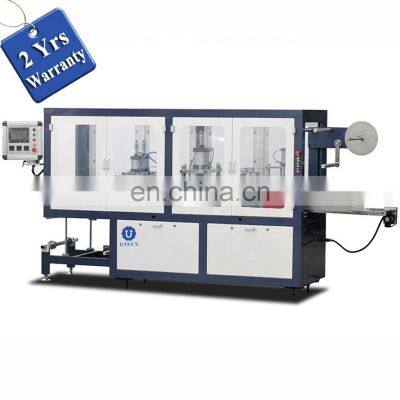 PCL450 Automatic pvc plastic cosmetic packaging empty eye shadow palette tray Forming making MachineVideosVideo demonstration only for referenceVideo: /watch?v=hOQXn-7_QKQ Product Description Features:1. The machine is designed and manufactured by the standard of “GMP” in medical industry and “QS” in food industry. 2. This machine can do forming, punching and cutting at the same time to avoid the cross-contamination of product.3. The forming heating plate can open and close automatically, also can delay to start, so as to control and lower the waste of the material during the production.4. Easy to replace the mould, application to different specifications of products.5. Design the mould according to customer’s requirements.6. Applicable projects: the material of HIPS, PVC, PET. Parameters: Punch frequency: 15-45(times/min) Air Consumption: >0.2m3/minMax Forming Area:430*280 mmMax Forming depth: 45mmStroke Length:0-260 mm Air Pressure (mpa): 0.4-0.7Power: 4.5 KwDimension: 3440*1833*1600mmWeight: 1950 kgPlastic type: HIPS PVC PET PS ETC. Components Brand List: ComponentsBrand:Origin:The Touch ScreenSchneider FrancePLCSchneider FranceThe Servo MotorSchneider FranceThe Servo DriverSchneider FranceTemperature ControllerKe QiangChinaCircuit BreakerChintChinaFrequency ConverterSchneider FranceMini RelayThe Omron JapanSolid-State RelayJin Hai San HeChinaWe reserve the right to change the component brand above without any notification in advance. Detailed Images Service Team Pre-sale Service After-sale Service A: Inquiry and consulting support A: English manuel and video instruction B: Sample testing support. B: Your technians can get trained in my factoryC: Invoice and Contract confirmation. C: Engineers available for overseas if necessary FAQ1.Q: What information should i let you know if i want to get a quotation?A: Detailed size of your finished products in Max and Min?B: Plastic sheet thickness in mmC: Some photos of your finished products2.Q: Are you a manufacturer?A: Yes we have been manufacturing such machines over 20 years and also we are a professional exporter. 3.Q: What about the payment term?A: Mostly 30%T/T in advanced, 60% when machine is finished after inspection and last 10% against copy of shipping documents..4.Q: What is the warranty?A: Two year warranty after sales (During the warranty period, we respond for free parts dispachment and the buyer is only required to cover the courier express once the machine has any problems. However we do not respond for the consumables and parts broken by mistakingly operation)5.Q: What is your aftersale service?A: Any questions will be responded within 24 hours by email, skype, phone call or Whatsapp/Wechat (+86-18258286679). In addtion, we have professional engineer available for overseas service..6.Q:What is the delivery time?A: Mostly it takes 10 to 30 workdays after receiving the deposit and confirming the drawing or samples as required. Pack & ShipWooden Case Loading and Transport Certifications Contact UsYOU ARE WELCOME TO CONTACT US ANYTIME AVAILABLE. Mobile/Whatsapp/Wechat: +86-18258286679 Email: utecs@ , utecsinter@ , danielsuer@ Skype: danielsuerWeb: