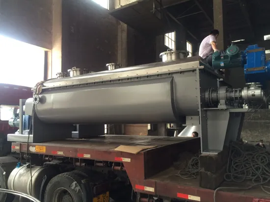 Paddle type dryer is a kind of heat conduction-based horizontal mixing dryer, the main structure is a jacket W-shaped shell with a pair inside low-speed rotating hollow shaft, the shaft is welding a number of hollow mixing blade, jacket and hollow stirrer are passed through heat medium, and the two heating surfaces dry materials at same time. Therefore, the machine has a prominent heat transfer rate than general conduction dryer. Biaxial or multi-axis type can be designed according to actual needs.The hot air is usually fed from the middle of dryer and discharged from the other side through the surface of material layer in the agitated state. Heating medium can be steam, hot water, or high temperature heat transfer oil. Features: *Typical conduction drying method and high thermal efficiency, it saves 30% to 60% or more than the usual convection drying energy.