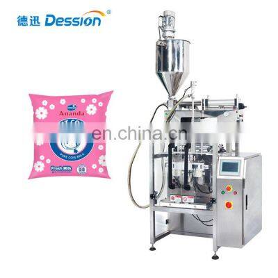 Fresh Milk Packing Machine With Plastic Bag Working Video LinkPlease click https://youtu.be/zGW1Po5iP44 Product Description Main Features*Computer control and English-Chinese touch screen for easy operation without stopping the unit.*Intelligent PID temperature controller for easy adjustment and good application to various laminated film and paper.*Packaging diversification, such as back-seal bag, side gusseted bag, linked bag, hole punched bag etc.*Full automation from bag making, measuring, filling, sealing, counting and date printing. Automatic Pouch Weighing And Packing Machine Combination includes: 1) Main EngineITEMDS-320LDS-420LDS-520LDS-720LFilm WidthMax.320mmMax.420mmMax.520mmMax.720mmBag Length80-240mm80-300mm80-350mm100-450mmBag Width50-150mm60-200mm80-250mm100-350mmFilm Thickness0.04-0.08mm0.04-0.08mm0.04-0.08mm0.04-0.08mmFilm Roll DiameterMax.320mmMax.320mmMax.320mmMax.320mmPacking Speed5~70 bags/min5~60 bags/min10-50 bags/min10-40 bags/minPower220V, 50/60HZ, 2.0KVA220V, 50/60HZ, 2.2KVA220V, 50/60HZ, 3KVA220V, 50/60HZ, 3.6KVAMeasurementL)1185 * W)935 * H)1245 mmL)1217 * W)1015 * H)1343 mmL)1488 * W)1080 * H)1490 mmL)1716 * W)1260 * H)1820 mmOptional DeviceDate Coder / Air-filling Device / Punching DeviceMachine PackingWooden BoxWooden BoxWooden BoxWooden Box 2) Metering Pump & Material Feeding Bucket Working Process ApplicationFor materials in liquid shape, e.g. milk, oil, jam, water, etc.Various bag types are available, e.g. pouch, stand-up bag, cheerpack, back-sealing bag, 3 or 4 sides sealing bag, linking bags,etc. Packaging & ShippingPayment: 30% deposit in advance, 70% balance before shipment by T/T.Delivery time: 20-25 days after receiving 30% deposit. Optional Devices 1. Punching device 2. Tear notch device 3. Linking bag control device 4. Air filling device 5. Nitrogen inflation device 6. Code printer 7. Material gathering hopperCompany InformationSince 2005, Dession has been the leading manufacturer of packaging machinery, including pillow type packing machine,vertical packaging machine, automatic feeding line, flowing packing machine and other supporting facilities. During the last 10 years, Dession has more than 30 partners all over the world. Our packing machines have been shipped to various countries and areas, such as America, Brazil, Russia, British, Germany, India, Thailand, Malaysia, Vietnam and so on. DS-250X Speghetti Packing Machine DS-320Y Honey Sachet Packing Machine DS-420BZ Frozen Peas Packing Machine Contact usFor more information, please contact us by email or instant messages. Any email or message will be answered within 12 hrs. Fresh Milk Packing Machine With Plastic Bag