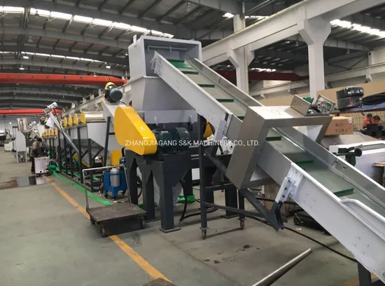 1. The main material is PE agriculture film, PE bags, shopping bags, beverage bags, PP woven bags, and some other soft material etc…2. The main process of the washing line is crushing, washing, drying parts. 3. The capacity of the washing line is from 200kg/h to 1000kg/h. 4. There crusher is to crush the film and woven bags to small pieces with size 70mm to 120mm. 5. Cold water sinking swimming tank can wash the common dirties, like the soil, sand, earth, stone, glass out. 6. High speed friction washer and hot sinking swimming tank can remove the strong dirties, like the grease, oil, glue. 7. With big capacity, double drying system can ensure the final products, PE PP flakes moisture lower than 5%.8. With squeezing machine, the moisture level of PE PP flakes can be lower than 3%. 9. Final PP PE flakes can be taken directly to the granulating/pelletizing line to make granules/pellets.