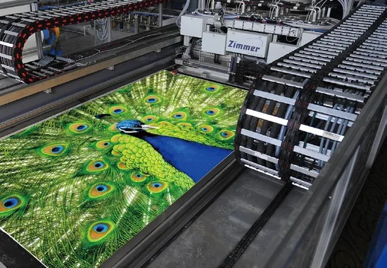 Dongsheng's printing machine printer head is a Chromojet printer produced by the world's advanced Austrian ZIMMER company. Chromojet is an independent design system that uses high-speed solenoid valves to spray compressed ink in dots onto carpets, forming various patterns on the carpet surface.Features of printed carpets: