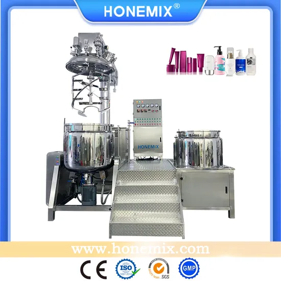 HoneMix 300L Lifting Vacuum Emulsifier mixer High Quality Face Cream And Hand Cream Homogenizer mixerVacuum emulsifying mixer machine consist of Water and Oil pot, Main emulsifying tank, Vacuum system, Tilting discharge system, Hydraulic lifting system(OPTION), Mixing system, Homogenizer system and Heating/Cooling system. All those functions work together to produce batches of good cosmetics products.Detailed Photos Lid PartsMan-HoleMaterial suction inlet