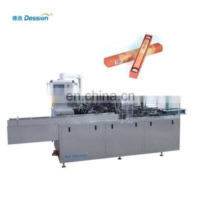 Products DescriptionDession box packing machine is widely applied in the single piece transparent film automatic packaging of all varieties of box-type things in the industries of pharmacy, food, healthy products, cosmetics, commodities, stationary and office supplies poker and cigarettes etc.ModelDS-B100Carton Size70-250*50-120*20-90mm(can be customized)Box Quality Requirement250-450g/ m2 (according to customers' request)Capacity40~80 box/minPower220V, 50HZMachine size(L)3800*(W)1100*(H)1900mmGas source0.6~0.8 MpaOptional DevicesAutomatic feeding deviceMachine function and characteristic1.The machine integrated with electrical ,pneumatic, mechanical , working stable and reliable ,three cams design is the newest innovative and had patent and CE approved .2.It devices with imported components ,such as omron temperature controller,risk bearing. and all frame are made by ss 304.3.It uses inverter to control the speed, so could adjust according to the operation need.4.The mould change easy ,without dismantle drive chain ,hopper .save time greatly5.New type double safeguard construction , won't broke machine parts for any incident .6.One way hand wheel prevent from backward operation, and protect worker's safety when the machine operates for still hand wheel.7.New type dual cutting knife replace traditional single knife, so could use for very long time.Details ImagesProduct conveythe product convey pulls the product into the formed carton.Box storage slotPut the box in the storage slot.Bag taking deviceThe suction cup automatically sucks the box and shapes the box type.Pushing devicePush the product into the corresponding tray continuously while the machines is running.Box ear floding deviceThe box is automatically folded and sealed during transportation.Finished product outletThe product has been placed in the box and the carton has been packaged,the finished product is output.Why Choose UsDession is a modern packaging equipment solustion provider integrating R&D, production and sales.Since the establishment of the company, with the continuous exploration, research and application of advanced technology, the company's development has begunscale, with an innovative team of professional and technical personnel, engineers, sales and after-sales service personnel.Dession has a professional team to provide customers with various packaging solutions. Fully understanding the needs of customers,engineers design the most suitable solution. We have our own processing and assembly workshop and quality inspection and debugging process to ensure the quality of the machine. After acceptance by the customer, they are packed in international standard wooden cases and shipped. Recommend ProductsOur CompanyDession a leading manufacturer of Vertical Powder/Granule/Liquid Packaging machine, pillow packing machine and supporting facilities, which has successfully developed more than 80 kinds of packaging machines. Dession Packaging Machine has widely applied for different fields throughout the world, such as food/industrial food, medicines, hotel supplies, disposable goods, rubber goods, daily appliances, hardware fittings, sporting goods, toys etc.Dession has more than 5,000 square meters of production plants, 3 production workshops and a parts processing workshop, including small vertical machine production workshops, large vertical machine production workshops and pillow machine production workshops.CertificationsPacking & DeliveryPayment1.T/T and Western Union are accepted2.30% deposit before production and 70% balance before shipment3.All banking charges outside China are on buyersShipping1.Upon receipt of payment , delivery date will be in 15-30 working days,2.By Air, by Sea or by Express (DHL etc)3.Shipment cost will depend on the destination, shipment way and the weight of the goodsFAQQ1:Do you have manual or operation video for us to know more about the machine? Yes, not only manual or operation video, 3D drawing also available to make as per your design,also the video we can make of testing the material from our packaging machine if your packing goods easier for us to find from our local market. Q2:How can I trust you for the first time business ?Please note our above business license and certificate. And if you don't trust us, then we can use Alibaba trade assurance service, guarantee your money, and guarantee your machine's on-time delivery and machine quality.Q3:Is engineer available to serve oversea?Yes, but the travel fee is paid by you. So actually to save your cost, we will send you a video of full details machine installation and assist you till the end.Q4:How can we make sure about the machine quality after we put the order?Before delivery, we will send you the pictures and videos for you to check the quality, and also you can arrange for quality checking by yourself or by your contacts in China.Q5:Will you provides the door to door service?Yes. Please offer us your final destination, we will check with our agent to see if it available, and most of the area is ok for us to clearing and sending in your countries.