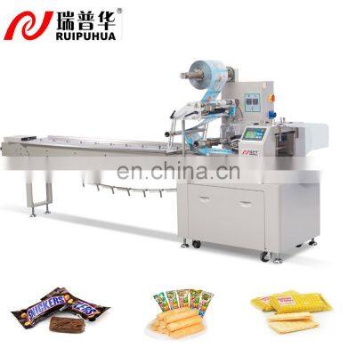 Horizontal pillow flow pack food bread cookie biscuit chocolate snacks soap automatic packing machine Horizontal Pillow Bag Automatic Flow Pack Wrapping Machine Three Servo Packaging Machine is mainly used for various kinds of solid objects with regular shape (Square/ Rectangle/Circular/Ellipse/Flake etc.) such as food, pharmaceuticals tools, daily necessities, hardware, or any other products loaded in box or tray. ModelZP-500SGPackaging speed(bag/minute)35-300bag/minPacking sizeL60-Infinite W30-150mm H5-50mmMaximum width of film(mm)<400mmThickness of film(mm)0.03mm-0.05mmTotal power220V,50/60HZ,6.3KWOverall size(mm)(L)4000*(W)960*(H)1600mmWeight550kgPackage4.0CBM,2CASESOverall size (mm)OPP/CPP, PT/PE, KOP/CPP, ALU-FOIL etc. (1) Menu storage and memory functionThe controller can save a variety of parameter configurations, and the recipe can be used when the product or packaging film is replaced by calling out the formula on the touch screen. (2) Bag length unlimitedThe industry-leading electronic cam algorithm, the bag length range is from 60mm to unlimited length, the bag length is set and cut immediately in one step, saving time and film. (3) Nitrogen filling function (3) No product, no bag function/ Anti-cutting functionAdvanced electronic anti-cutting, electronic anti-empty bag algorithm. The empty material film stops, saving packaging materials. (4) 3-Servo motor/PLC controlThe horizontal seal is controlled by an independent servo motor, and the longitudinal seal and the feeding tailstock are controlled by a frequency conversion motor. The mechanical structure is simple, the operation is stable, and the noise is low. (5)High precisionThe feeding speed is automatically tracked, and the packaging machine automatically accelerates and decelerates. High speed, higher precision, double knife speed can reach 300 packs/min, error ±1mm. (6) Man-machine interface, convenient and quick parameter setting, automatic tracking of color code, automatic correction of cutting length. Digitally input the sealing and cutting position to make the sealing and cutting position more accurate. (7) The fault is automatically diagnosed, and the fault display is clear at a glance. (8) Well-known brand servo motor/controller/touch screen, vertical sealing/discharging belt brush. (9) Optional configuration: coding machine, double support paper, automatic film connection, inflation, spray alcohol, lifting panel, stainless steel machine body. 1.Operating Manual / videos of machine installation, adjusting,setting, maintenance are available for you.2.If any problem happen, and you can not find out the solution, online face to face service is available 24 hours. 3.Engineers and technicians are available sent to your company for service if you agree to pay the expenditure.4. One year warrany for the machine. During warranty, parts broken not caused by mis-operation, We will free change the new parts for you.5. We have an experienced team for after-sale service, Any questions welcome to contact us. Company Honor Why choose us? 1)Why should you choose Ruipuhua(Rapid) Packaging machinery ?Ruipuhua(Rapid) is specializing in packing machine for more than 10 years,with good quality and competitive price. 2)Can you provide after-sale service?Of course,we have engineers available to service machinery overseas . 3)Can I visit your factory and send workers for learning ?Yes,we will provide you with training for the workers. 4)What is Our Advantages?1. Provide customized services for special requirement;2. Competitive price and reliable quality;3. Professional inspection department to guarantee quality. 5)How to Contact Us?Send your Inquiry Details in the Below, Click "Send" Now!