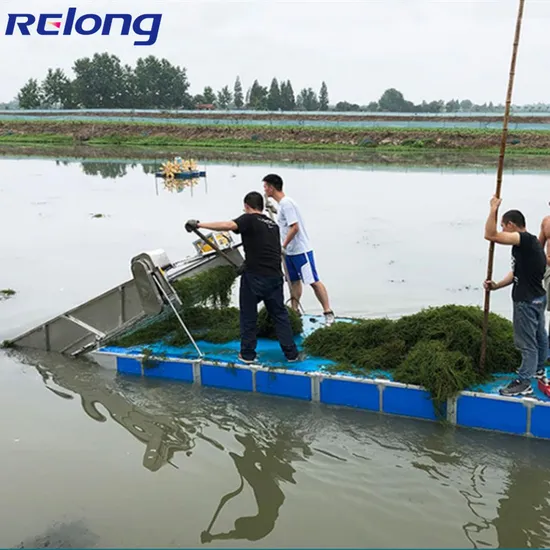 The aquatic weed harvester is a special mower for shrimps and crabs. The use of mechanical automation will cut all the various water plants in the pond about 1 meter below the water surface and salvage them ashore, which is a good way to improve the breeding environment of shrimps and crabs. The whole machine includes a foam hull, a propeller, a scissor part, and a conveying part; the main engine is operated, and the propeller pushes the foam hull forward to cut the grass under the water at one time and salvage it ashore.