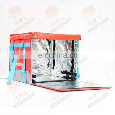 Product DescriptionProduct Model:ACD-B-002Size&Capacity:Outer size:52*52*48CMInner size:50*50*46CM129LMaterial:Outside 500D PVC+5mm insulation foam+Aluminum foil lining+PVC zipper+Food grade hollow plateColor: Black ,red ,orange,blue,yellow, green or custom colorMOQ:300PCSCarton package size:41*49*66 5pcs/ctnsDelivery date:30 days for mass productionLOGO:could be customerized if meet our MOQOEM/ODM:WelcomeOEM sample time:around 7-10 daysPayment:Trade Assurance/ 30% for order deposit, 70% blance before deliveryFeature:1.Backpack and handle design.2.Large capacity.3. The thick 500D PVC +5mm insulation foam4.aluminum interior providing an extra layer of heat reflection, will not retain moisture or odors.5.This delivery bag is collapsible and easy to disassemble.6. Custom logo and colors.use way:On bicyle,on car,hand,liftCan be use as cooler bag or keep hot bag for pizza,cake,fast food delivery or keep fruit fresh and cans drinking cool.Company IntroductionFAQRelated Products