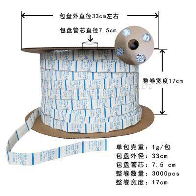 Scroll desiccant with high quality silica gel raw material production and processing. Products stable chemical properties, non-toxic, tasteless, good moisture-proof effect, widely used in food health products and instruments moisture-proof dehumidification, products 3000 packs/roll, can be customized according to customer requirements.