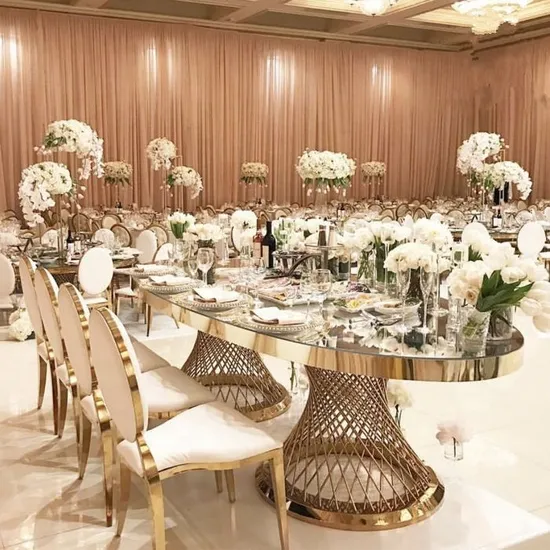 | Description | Modern Hotel Chair Ding Table Wedding Chair White Stainless Steel Gold Wedding Oval Back Dining Chair for Banquet Events Dinner Room |