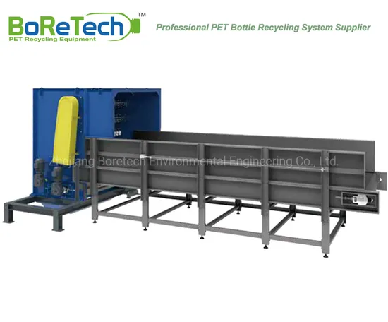 De-baling unit adopts weighing-connected feeding device by high automation technology and break up bottle bales and remove mixed metal. The special knife structure can avoid any unexpected mechanical clogging.
