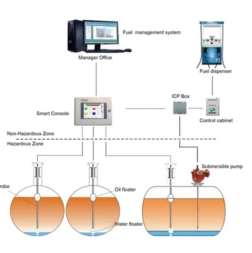 | 3.Probe + SS160consol + FMS | ∗ Besides the function of solution 1∗ Customer information management and management of one gas station or many gas station in chain.∗ Service management system of Material flow, capital flow, information flow and work flow based on Wide Area Network and Local Area Network. |