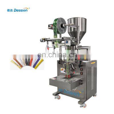 Sugar bag filling automatic packing machine sugar stick packing machine priceMachine IntroductionPackaging ApplicationThis machine is suitable for the food, medicine, chemical industry, cosmetics industry of particles of measurement packing.Such as sugar, salt, nut, snack food, desiccant, candy, etc.Packing EffectThe machine can provide back-seal packing, 3-side seal packing and 4-side seal packing effects.It can be upgraded to add the bag with hanging holes and easy tear effect according to the needsMachine Structure and ParametersModelDS-320AMeasuring Range1~100gBag Length30~170 mmBag Width30 ~ 130 mmPacking Speed30 ~60 bags/minMachine Power220V, 50Hz, 1.4KW Machine Size900*1100*1900 mmMachine Weight400 KGMachine Characteristics1. All the works of bag making, measuring, filling, sealing, cutting and counting can be done automatically, at the same time, it can also according to the demand of customers printing batch number and other functions.2. The touch screen operation, PLC control, drive stepper motor to control the bag length, stable performance, easy to adjust and accurate detection. 3. Choose the intelligent temperature controller and PID control to ensure the error range of temperature controlled within 1 ℃ centigrade.Details ImagesMachine WorkflowThis machine is easy to operate. Just set the parameters on the screen, and then you can start the machine. Put the product in the hopper, the machine will automatically pull the film, the bag is formed, sealed, and finally the bag is cut.Large capacity hopperHigh-precision measuring cup deviceFilm holderBag fromerBag sealing deviceBag cutting deviceRelated ProductsWhy Choose UsVR1. Professional and Strong TeamDession has a professional team that can provide customers with various packaging solutions. After fully understanding the customer's needs, we provide the most suitable packaging solution to the customer. Then start the production of the machine. We have a strong production and processing capacity, from the customized processing of accessories to the assembly and debugging ofthe machine. Finally, it is packaged and shipped, and it only takes a week to complete.2. Excellent transportation serviceAccording to the needs of customers, we can provide sea transportation, air transportation, and land transportation services, so that you can get the machine as soon as possible. Provide door-to-door transportation services.3. Timely and effective after-sales serviceChoosing us is not only buying a machine, but also our professional and timely service. 1. When the machine is delivered, we will attach a video of the installation and operation of the machine, so that you can use the machine quickly. 2. All electrical appliances of our machines have a one-year warranty, and we will replace them if they fail. 3. When your machine fails, we will have professional engineers to provide professional online after-sales service to help you solve the problem. 4. If the problem cannot be solved online, we will arrange an engineer to repair it on site within a week.Buyer FeedbackWe have 8 years of experience in foreign trade and export, and now our customers have spread to 90 countries all over the world. With our high-quality machines and professional services, we have won unanimous praise from our customers.Company ProfileDession a leading manufacturer of Packaging machine and supporting facilities, which has successfully developed more than 80 kinds of packaging machines. Dession Packaging Machine has widely applied for different fields throughout the world, such as food/ industrial food, medicines, hotel supplies, disposable goods, rubber goods, daily appliances, hardware fittings, sporting goods, toys etc. Dession has more than 8000 square meters of production plants, 5 production workshops and a parts processing workshop, including small vertical machine production workshops, vertical machine production workshops, pillow machine production workshops, cartoning machine production workshop and filling machine production workshop.FAQQ1:Do you have manual or operation video for us to know more about the machine? Yes, not only manual or operation video, 3D drawing also available to make as per your design,also the video we can make of testing the material from our packaging machine if your packing goods easier for us to find from our local market. Q2:How can I trust you for the first time business ?Please note our above business license and certificate. And if you don't trust us, then we can use Alibaba trade assurance service, guarantee your money, and guarantee your machine's on-time delivery and machine quality.Q3:Is engineer available to serve oversea?Yes, but the travel fee is paid by you. So actually to save your cost, we will send you a video of full details machine installation and assist you till the end.Q4:How can we make sure about the machine quality after we put the order?Before delivery, we will send you the pictures and videos for you to check the quality, and also you can arrange for quality checking by yourself or by your contacts in China.Q5:Will you provides the door to door service?Yes. Please offer us your final destination, we will check with our agent to see if it available, and most of the area is ok for us to clearing and sending in your countries.