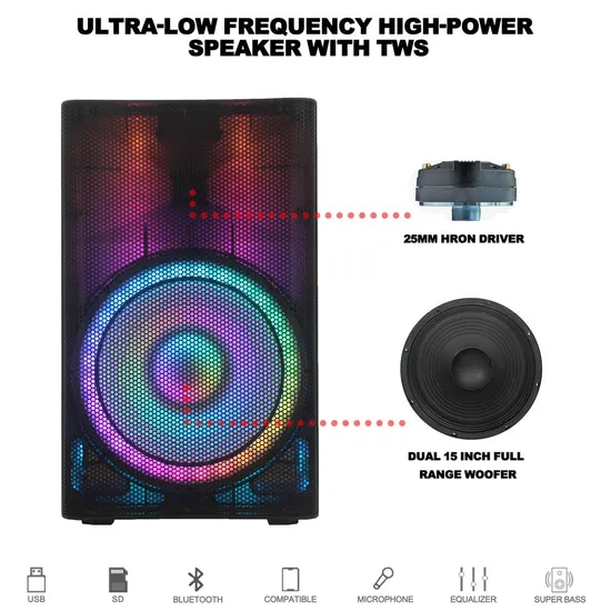 15Inch Audio Sound box Full Translucent Bluetooth Party Speaker with Flame Light 2000W Bass Active 2 Way Karaoke/PA System Loudspeaker Bochina Parlante