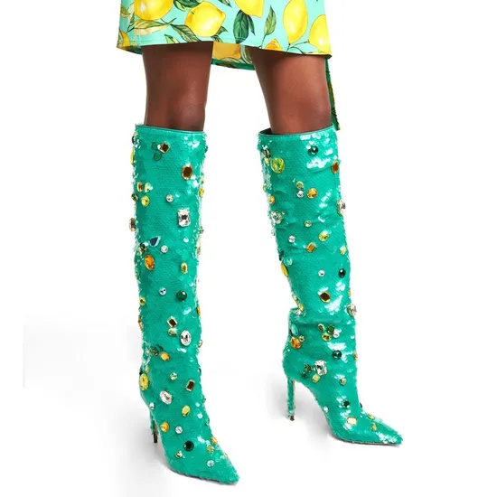Products Description Ladies Plus Size Bright Crystal Stiletto Heel Pointed Toe Slip On High Heels Teal Knee Boots for Women