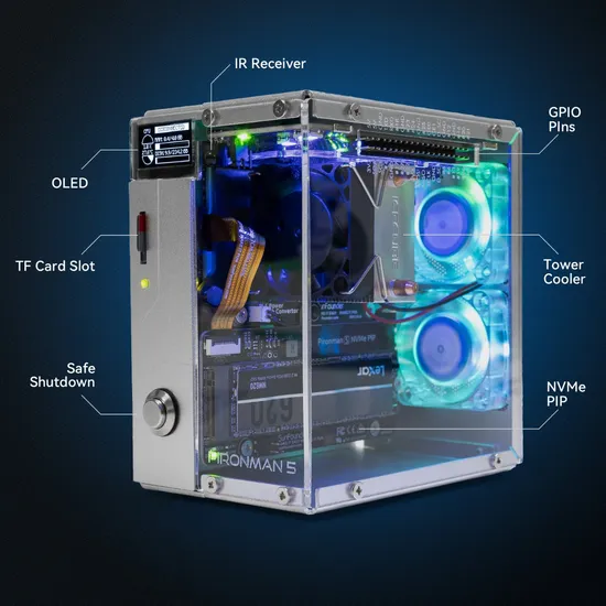 Description **Raspberry Pi 5 Mini PC Case**: Enhance your Raspberry Pi 5 to built with sturdy aluminum, superior cooling, NVMe M.2 SSD support, OLED display, RGB lighting, standard HDMI ports x2, and a secure power switch. Perfect for NAS, Home Assistant, Media and Game Centers.