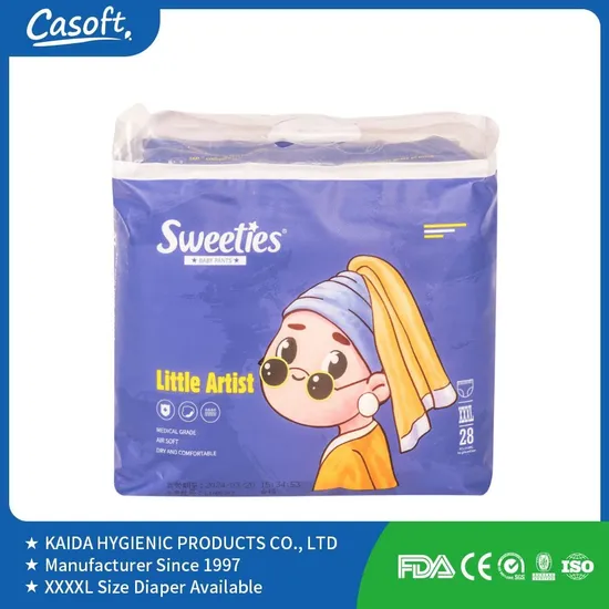 Features: 1. Soft, breathable and clothlike, can never hurt your baby's tender skin, and make him/she feel comfortable and natural; 2. Super absorbency, can absorb the urine effectively and instantly to keep the surface dry. 3. Back sheet: Soft and waterproof, can help keep the bottom dry and clean. 4. 3D leakage-proof design: Soft and waterproof non-woven fabric, can prevent the liquid leakage effectively. 5. Acquisition distribution layer can scatter liquid and is easier to lead the cotton core absorbing the liquid; 6. Full rise waist,tears open easily. 7. Wetness indicator: Cartoon picture printed. You can change it when the pattern fades. 8. Competitive price, good quality and high absorption.