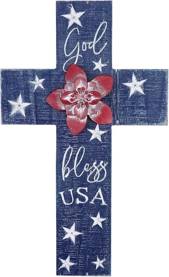 Hanging Wooden Wall Crosses for Home Decor, Red Metal Flower and Carved God Bless America Patriotic Decor