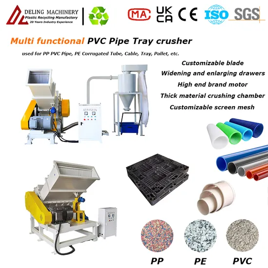 This product is suitable for crushing PVC pipe, PE corrugated pipe, PVC gusset plate, various plastic pallets and the etc., the crushing length can reach 6 meters, and the diameter can reach 800mm, the thickness is 20mm of the materials. It avoids the process of using conventional machines to decompose the products, reduce the degradation of raw materials, lower labor intensity, and improve the crushing recovery rate.