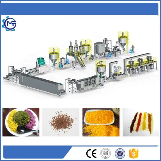 Product Description Automatic Cassava Rice Porang Rice Instan Rice Konjac Rice Processing Machine reconstituted rice machine is based on food nutritional demand and advanted technology. It is fit for modern enterprise. Automatic Cassava Rice Porang Rice Instan Rice Konjac Rice Processing Machine reconstituted rice machine has the advantage of high automatic and saving engery.Automatic Cassava Rice Porang Rice Instan Rice Konjac Rice Processing Machine reconstituted rice machine can adopt rice, millet, black rice, buckwheat etc. as main materials. Then it can be treated with vitamins, protein and mineral substance. After the processes of extruding, cooking and shaping, the material can be made to reinforced rice, golden rice, buckwheat rice, solanum tuberdsm rice etc.The cooking method is same as natural rice. Even more, it is easier and more convenient.