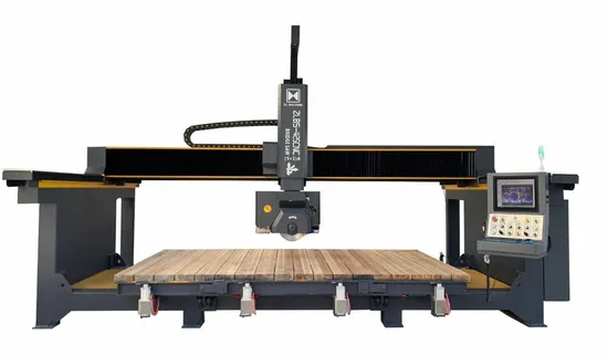 For processing marble, granite, porcelain, and quartz stone countertops, we provide CNC Bridge Saws of the ZLBS-425CNC/(5+1) A type. It is a precise, effective, and user-friendly machine. The operator begins processing after taking a picture of the plate and adding the drawing layout to the image. Saw blades, milling cutters, suction cups, and pressure plate cylinders will automatically generate combined processing steps according to the program. Before the milling cutter works, the program will automatically control the cylinders to press the plate. When the milling cutter is over, the cylinders will automatically drop, which is convenient for saw cutting.If the blade-cutting path conflicts, the suction cup can help.Additionally, conventional cross and straight slices of plates, various polygons, circles, ovals, and maws, as well as L-shaped countertops and four-sided under-hung countertops, are all cut and chamfer using the CNC Bridge Saw. The basin, faucet, and inner angles are all processed by the miller. Therefore, the machine is used to help install countertops without any dust. We also provide OEM/ODM production machine service; if you require anything, feel free to contact us.