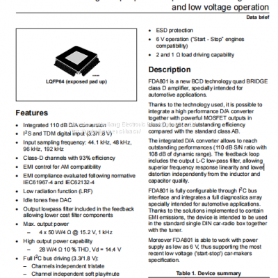 FDA801 is a new BCD technology four bridge D-stage amplifier specifically designed for automotive applications.