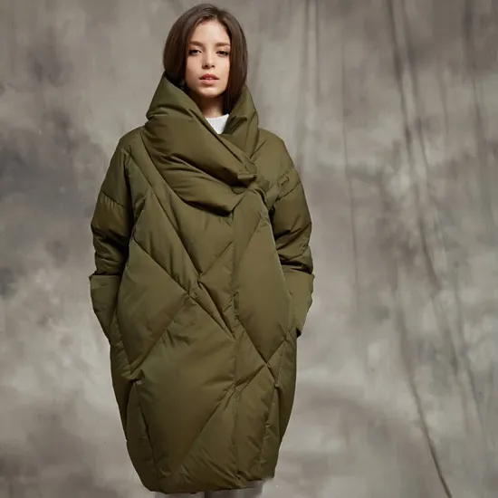 Products Description This is new design of Down coat. We use high quality duck down, the content is 90% duck down. So the coat is puffy and warm , it's good choose in winter season. Feature *Brand: Custom brand *Fabric Type:Fabric is nylon *Sleeve:Long Sleeve *Style: Fashion&Casual *Dress length: At knee *Design: Solid Color, Long Sleeve, Loose fit, Side Pockets, Hooded, Wrinkled cuffs Size Information