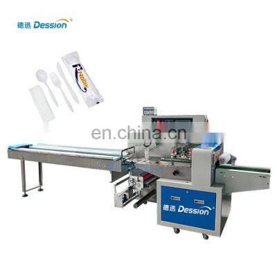 Disposable tableware automatic wrapping machine cutlery packing machine flow pack machine wooden plastic cutleryMachine IntroductionPackaging ApplicationAutomatic flow packing machine is a widely used packing machine. Suitable for all kinds of product packaging. Including medicalsupplies, vegetables and meat, baked bread, snacks and candy, daily necessities, hardware accessories, etc.Packing EffectThe effect after packaging is back-seal bag. According to demand, other devices can be customized or upgraded to meet other models. For example, pillow bag with hole, bag with label, gusset bag, etc.Machine Structure and ParametersMachine Characteristics1. Double frequency conversion control, the bag length canbe set and cut, no need to adjust the air, one step in place, saving time and film.2. Man-machine interface, parameter setting is convenient and quick.3. Fault self-recognize function, fault display at a glance.4. High-sensitivity photoelectric eye color tracking, digital input sealing position, make sealing position more accurate.5. Temperature independent PID control, better suitable for various packaging materials.6. Positioning stop function, no sticky kuife, no waste film.7. The transmission system is simple, the work is more reliable, and maintenance is more convenient.8. All control is implemented by software, which is convenient for function adjustment and technical upgrade, and never lags behind.ModelDS-250XDS-350XDS-450XDS-600XDS-700XDS-800XFilm Width(mm)Max.250Max.350Max.450Max.600Max.700Max.800Bag Length(mm)45~33065~330120~450130~450120~600120~600Bag width(mm)30~11050~16060~21060~28050~33050~380Products Height(mm)Max.70Max.80Max.110Max.150Max.150Packing Speed(bag/min)40~23030~15030~15020~12030~150Machine Power220V / 380V, 50/60HZ,2.4KWMachine Size(L*W*H, mm)3920*670*13204020*720*14503900*900*14683990*1000*14684400*1100*14604400*1200*1460Machine Weight800KG900KG900KG1050KG1050KG1050KGDetails ImagesMachine WorkflowThis machine is easy to operate. Just set the parameters on the screen, and then you can start the machine. Put the product on the conveyor belt, the machine will automatically pull the film, the bag is formed, sealed, and finally the bag is cut.Multilingual touch screenThe machine supports various language customization, easy to operate.High sensitivity eye sensorThe eye sensor automatically senses the color code to ensure accurate and beautiful packaging effects.Replaceable bag formerWhen you want to change the bag width, you only need to change a different size bag fromer.Electronic control componentUse Panasonic PLC and frequency converter to ensure the stable operation of the machine.Related ProductsWhy Choose UsVR1. Professional and Strong TeamDession has a professional team that can provide customers with various packaging solutions. After fully understanding the customer's needs, we provide the most suitable packaging solution to the customer. Then start the production of the machine. We have a strong production and processing capacity, from the customized processing of accessories to the assembly and debugging ofthe machine. Finally, it is packaged and shipped, and it only takes a week to complete.2. Excellent transportation serviceAccording to the needs of customers, we can provide sea transportation, air transportation, and land transportation services, so that you can get the machine as soon as possible. Provide door-to-door transportation services.3. Timely and effective after-sales serviceChoosing us is not only buying a machine, but also our professional and timely service. 1. When the machine is delivered, we will attach a video of the installation and operation of the machine, so that you can use the machine quickly. 2. All electrical appliances of our machines have a one-year warranty, and we will replace them if they fail. 3. When your machine fails, we will have professional engineers to provide professional online after-sales service to help you solve the problem. 4. If the problem cannot be solved online, we will arrange an engineer to repair it on site within a week.Buyer FeedbackWe have 8 years of experience in foreign trade and export, and now our customers have spread to 90 countries all over the world. With our high-quality machines and professional services, we have won unanimous praise from our customers.Company Profile Dession a leading manufacturer of Packaging machine and supporting facilities, which has successfully developed more than 80 kinds of packaging machines. Dession Packaging Machine has widely applied for different fields throughout the world, such as food/ industrial food, medicines, hotel supplies, disposable goods, rubber goods, daily appliances, hardware fittings, sporting goods, toys etc. Dession has more than 8000 square meters of production plants, 5 production workshops and a parts processing workshop, including small vertical machine production workshops, vertical machine production workshops, pillow machine production workshops, cartoning machine production workshop and filling machine production workshop.FAQQ1:Do you have manual or operation video for us to know more about the machine? Yes, not only manual or operation video, 3D drawing also available to make as per your design,also the video we can make of testing the material from our packaging machine if your packing goods easier for us to find from our local market. Q2:How can I trust you for the first time business ?Please note our above business license and certificate. And if you don't trust us, then we can use Alibaba trade assurance service, guarantee your money, and guarantee your machine's on-time delivery and machine quality.Q3:Is engineer available to serve oversea?Yes, but the travel fee is paid by you. So actually to save your cost, we will send you a video of full details machine installation and assist you till the end.Q4:How can we make sure about the machine quality after we put the order?Before delivery, we will send you the pictures and videos f