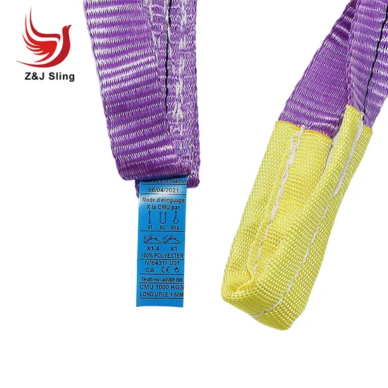100% High Tenacity Polyester Low Elongation Each stripe is equal to 1 ton capacity Color:Violet,Green,Yellow,Grey,Red,Brown, Blue etc. As standard or required. WLL: From 1Ton to 20Ton or up Safety Factor: 5:1, 6:1, 7: 1 Length: As required Width:According to EN1492-1 Standard or As required Packing: PE shrink wrap, carton and pallet
