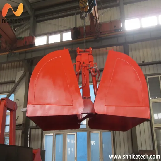 The hydraulic double lobe grab is mainly composed of lifting device, bearing beam, oil cylinder, shunt body, bucket body, etc. The bucket body and the bearing beam are connected by a pin shaft; The piston end of the cylinder is fixed above the bearing beam, and the piston rod is fixed on the upper part of the bucket body. With the cylinder piston rod retracting and extending, the bucket body rotates with the beam pin as the hinge point to complete the opening and closing of the grab. The connecting plate effectively adjusts the opening and closing positions of the two buckets to ensure synchronous rotation of the left and right buckets.