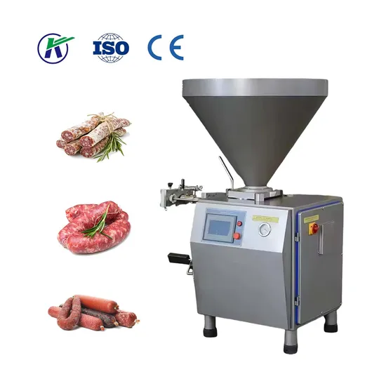 Vacuum filling machine is a set of quantitative filling, high-speed kink in a vacuum filling machine, in the vacuum state to complete the filling process, effectively prevent fat oxidation, avoid protein hydrolysis, reduce the amount of bacteria inventory, effectively ensure the shelf life of the product and product color bright, pure taste, is the highest end of the filling machinery products. This machine is driven by a servo motor, displayed on a touch screen, controlled by a PLC, and vacuum filled.It can be used to fill sausage products such as minced meat, ham, and other types of casings, as well as natural casings, collagen casings, fiber casings, etc. It can also be used to fill various bottled and boxed products. The material transfer is gentle, and it is equipped with double filling tubes. It can be used in conjunction with automatic wire tying machines, with fast filling speed and improved production efficiency. It can also be used in conjunction with a knotter to produce products at high speed. This machine is filled under vacuum, and the hopper can be flipped, making cleaning more convenient. This machine is made of high-quality stainless steel material, with key components specially treated for durability and wear resistance. The control parts are all made of flexible components, and the appearance has undergone advanced surface treatment technology. It is aesthetically pleasing, compact in structure, easy to maintain, and equipped with safety protection devices. It is an ideal equipment for the meat processing industry. The knotter is also driven by a servo motor, which cooperates with the filling servo motor and is controlled by PLC to ensure accurate twisting and quantitative accuracy. It uses bearings for rotation, with high speed and low noise.