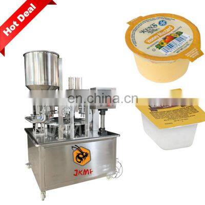 Factory Price Automatic Honey Mustard Dressing Cup Filling and Sealing MachineProducts DescriptionApplicationThe rotary cup machine is fully automatic to container-loading, fill, foil-loading, seal and overlid stackable containers with reliability and accuracy. This cup filling sealing machine is equipped with PLC and touchscreen HMI, gives flexiblity to configure properly for your application. All control functions are adjustable via the menu-driven operator interface. Precision made and built to last, our cup filling and sealing machine combines innvoative features, customized for a perfect fit every time.The mold of this machine can be customized according to product requirements.The machine can be customized for filling sealing packing ice cream, yogurt, milk, soymilk, chilli sauce,juice, honey, ketchup, mineral water etc.Machine InformationHoney spoon filling machineModelJK-250HSJK-320HSPacking speed800~1000 pieces/hour1600~2000 Pieces/hourFilling volume1~20gMachine power220V/380V,50HZ,4KW220V, 50HZMachine size(L*W*H)1217*1015*13431250*1250*1650Machine weight250KG280KGMain Features1. Digital screen display with numerical setting and flexible operation.2. Imported PLC control system and color touching screen, easy operation.3. Imported film driving system and color sensor enable accurate position.4. PID independent control of temperature, more suitable for different packaging material.5. Multiple automatic alarming functions, maximum deduction the loss.6. Dual encoders enable more stable performance.Machine Working ProcessTouch Control ScreenSet the parameters on the screen, such as filling weight, speed, etc.Falling Cup DeviceSpoon drop down one by one automatically.Metering Filling DeviceAutomatically measure the required weight and fill it into the cup.Foil Film Lid StationVacuum arm suck and put foils on cups for cup sealing.Heating sealing deviceAutomatic high temperature sealing, good sealing performance.Automatic Delivery of Finished ProductsGet perfect finished cup.Why Choose UsJIKE BEE MACHINERY has a professional team to provide customers with various packaging solutions. Fully understanding the needs of customers,engineers design the most suitable solution. We have our own processing and assembly workshop and quality inspection and debugging process to ensure the quality of the machine. After acceptance by the customer, they are packed in international standard wooden cases and shipped.Company ProfileFoshan Jike Bee Automation Equipment Co., Ltd. is a manufacturer of automatic packaging equipment.We are a production-oriented enterprises focused on product innovation, factory direct sales and perfect after-sales service in one.The automatic packaging equipment for granule, powder, liquid and sauce produced by the Jason company is at the advanced level of the industry,it can be customized production automatic material packaging line for all kinds of products .Mainly applicable to: food, hardware, drugs, daily chemicals, pesticides, fruits and vegetables, cosmetics, other industries.The company has its own patent and product technical certification, which can bring customers high quality equipment and worthy of customer trust.Customer PhotosOur customers have covered more than 80 countries around the world.And give us unanimous praise.CertificationsFAQQ1:Do you have manual or operation video for us to know more about the machine? Yes, not only manual or operation video, 3D drawing also available to make as per your design,also the video we can make of testing the material from our packaging machine if your packing goods easier for us to find from our local market. Q2:How can I trust you for the first time business ?Please note our above business license and certificate. And if you don't trust us, then we can use Alibaba trade assurance service, guarantee your money, and guarantee your machine's on-time delivery and machine quality.Q3:Is engineer available to serve oversea?Yes, but the travel fee is paid by you. So actually to save your cost, we will send you a video of full details machine installation and assist you till the end.Q4:How can we make sure about the machine quality after we put the order?Before delivery, we will send you the pictures and videos for you to check the quality, and also you can arrange for quality checking by yourself or by your contacts in China.Q5:Will you provides the door to door service?Yes. Please offer us your final destination, we will check with our agent to see if it available, and most of the area is ok for us to clearing and sending in your countries.