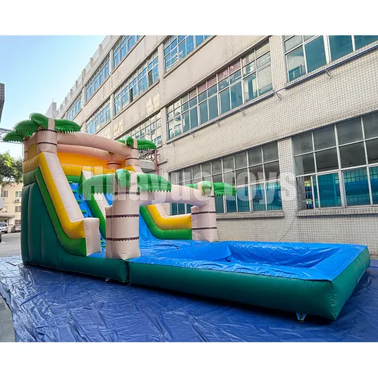 OverviewCommercial Palm Tree Design Large Inflatable Water Slide with pool Water Slide for entertainmentHuayue inflatable products are made by high quality material and advanced welding machine to ensure high quality. Just one time inflation will keep air well to last long even under extremely low or high temperature. These inflatables are usually used as toy games for water parks, open seas, lakes, pools, etc.