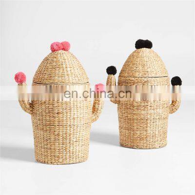 Best Price Water Hyacinth Pompom Cactus Hamper Home Decoration Clothes Wicker Basket Iron frame Best Price Wholesale