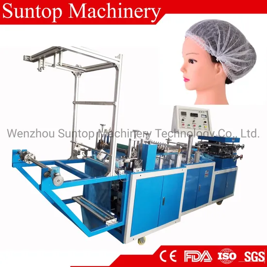 Bouffant Cap Machine Medical Nursing Cap PE Head Cover Non-Woven PP Mop Cap Strip Shower Cap Disposable Cap Making Machine. It adopts ultrasonic heat sealing method, frequency conversion speed regulation, and produces non-woven materials and plastic film materials. The disposable dust-proof non-woven strip caps are integrated into the finished product from feeding to finished products. You just feeding the material (Non-woven or PE Plastic film and rubber band ),then you will get final product.
