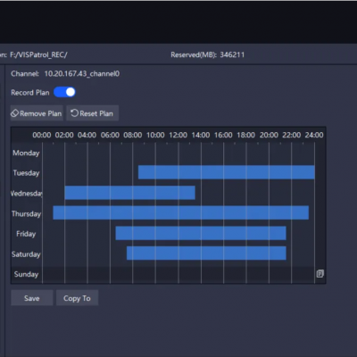 The software includes built-in NVR recording services, supporting up to 64 video channels for simultaneous recording. It also supports scheduled recording, playback review, and download of recorded footage.