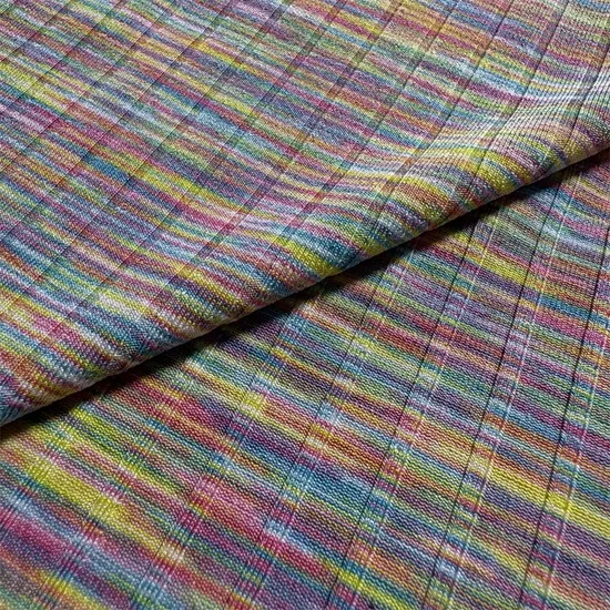 Product Description Knitted polyester segment colored silk high elastic ribbed fabric is a fabric that combines the superior performance of polyester fibers, the special effect of segment colored silk, and the ribbed structure, with unique charm and wide application value.