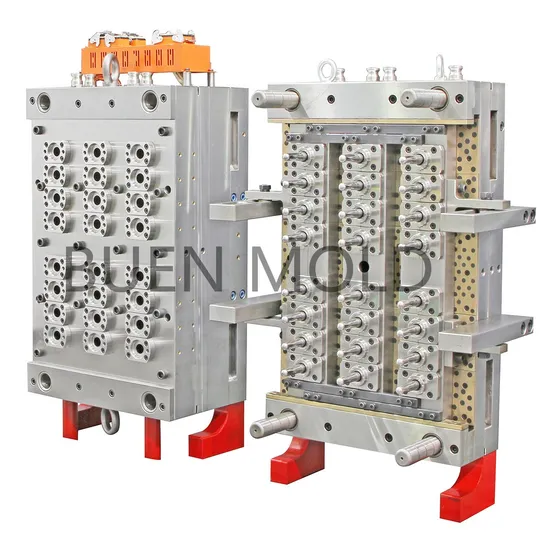 Ventajas del moldes de BUEN preformas Sistema de autobloqueo independiente para fácil de reparar; Diseño optimizado del circuito de agua de refrigeración y cobre berilio garantizan efecto de enfriamiento perfecto; Usamos materiales primas de acero inoxidable en el macho y la hembra para garantizar el mejor efecto de pulido; CMM sistema de detección de alta precisión controla eficazmente el tamaño y grosor de la pared del moldes de preformas; Diseño estructural especial y materiales primas para molde de frasca para evitar el problema de romper de la hembra; Las cavidades del moldes preformas se puede hacer desde 4 cavidades hasta 96 cavidades.