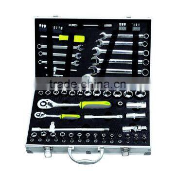 | content | 1. 14pcs 1/4" socket 2. 12pcs 1/2" socket 3. 2pcs 1/4" extension bar 2" 4" 4. 1pc 1/4" screwdriver 5. 1pc 1/4" sliding bar 6. 1pc 1/4" ratchet handle 7. 1pc 6"lenght 1/4" soft tube 8. 15pcs 1/4" socket bit 9. 17pcs 1/4"/25mm screwdriver bit 10. 1pc 1/2" bit adaptor 11. 2pcs 1/2" sliding bar 12. 2pcs 1/2" spark plug socket 13. 1pc triple using sliding bar 14. 1pc 1/2" universal joint 15. 1pc 1/2" ratchet handle 16. 9pcs wrench |