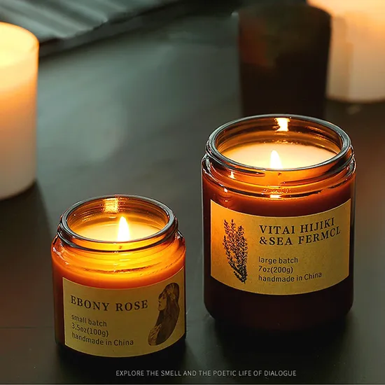 These hand made scented candles come in two sizes. The wax weight of the small size scented candle is 100 grams. There are two types of scents in stock for the small soya scented candles: Ebony rose is in the brown glass jar, while Australian tea tree is in the green glass jar. The wax weight of the big hand made scented candles are 200 grams, and there are two scent types of the soya candles in stock at present: The fragrance in the brown glass jar is Vital hijiki& Sea fermcl, while the fragrance in the green glass jar is Lime basil& Mandarine.