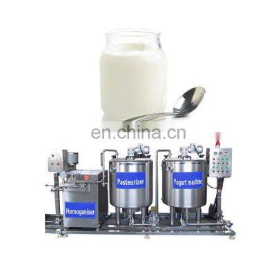 Product Description continuous pasteurizer yoghurt making yogurt cup filling sealing machineIntroduction of Yogurt production lineThe whole yogurt production line can sterilize various dairy products, such as goat milk, horse milk, yak milk, yogurt, and fresh milk. The entire processing from the first step to the final yogurt takes approximately 6-8 hours. All are made of food grade stainless steel.Parameters of Yogurt production lineItemSize(mm)PowerVoltage1. Storage Tank1700*900*15502.6kw380v 50hz2. Milk Heating Tank1200*1000*165018kw380V/50hz3. Homogeniser1010*616*9754kw380v 50hz4. Pasteurizer1200*1000*165018kw380v 50hz5. Yogurt machine1200*1000*165018kw380v 50hz5. Filling machine 1300*1300*1750 // 1. Yogurt Storage tankThe raw milk is stored in a storage tank, and the temperature in the tank is set to 3-6 ° C. The fresh milk passes through a single filter to filter impurities of the fresh milk and finally enters the preheating tank through the milk pump.2. Milk Heating TankThe main purposes of milk heating in the yogurt production line are as follows:1). Kill microorganisms that may cause disease2). Eliminate most other organisms to increase the shelf life of the product3). Make the protein have a certain degree of denaturation. This improves the consistency and viscosity of the yogurt and prevents the separation of whey.3. HomogeniserThe benefits of homogenization for yogurt production are as follows:1)Improved the consistency of yogurt2)Higher stability for whey separation3)Yogurt looks whiter and has a more creamy and richer flavor than non-homogenous yogurt4)Better distribute stabilizers in the system4. PasteurizerBefore the fresh milk sterilization process is started, it is necessary to ensure that the water level of the sterilizer is reached at the water level mirror. Set the sterilization temperature (usually set temperature 85 ° C). Turn on sterilization heating, sterilization and stirring. When the milk temperature reaches 85 °C, the device will give an alarm and the sterilization will be completed.5. Yogurt machineThe pasteurized fresh milk is fed into the fermenter through the milk pump. Before the fermentation process is started, the temperature of the fermenter is usually set at 43 ° C, the fermentation time is usually 8 hours, the fermentation heating is started, and the fermentation is stirred. After the milk temperature has reached 43 degrees, the corresponding strain is added and the yogurt is fermented. After 8 hours, the yogurt fermentation process will sound an alarm. 5. Filling machineWe have the capacity of 200 L, 300L, 500L, 1000L, besides, our company also can supply the machine according the requirement of customer, the milk can be canned into bottle, bag or cup by filling machine. FAQ1. Do you want to produce liquid yogurt or solid yogurt?If you are producing liquid yogurt, you need a liquid-related machine.2. What is your daily capacity?We produce 200L, 300L, 500L, 1000L.3. Do you need to fill yogurt?We can match the filling machine according to your requirements, can be filled, can be bottled.4. What is the temperature range of the refrigerating tank?The temperature range is 4-45 degrees. If it exceeds 45 degrees, the machine will not work.5. What is the ratio of materials that can be added during the yogurt making process?The ratio of bacteria to milk and white sugar is: 1L milk plus 6-8% sugar, 1g strain6. What machines are needed to make yogurt?Milking - preheating - sterilization barrel - homogenizer - yogurt machine - filling machine7. What is the working principle of the sterilization barrel?It is mainly pasteurized by high temperature sterilization.Feedback Contact Us